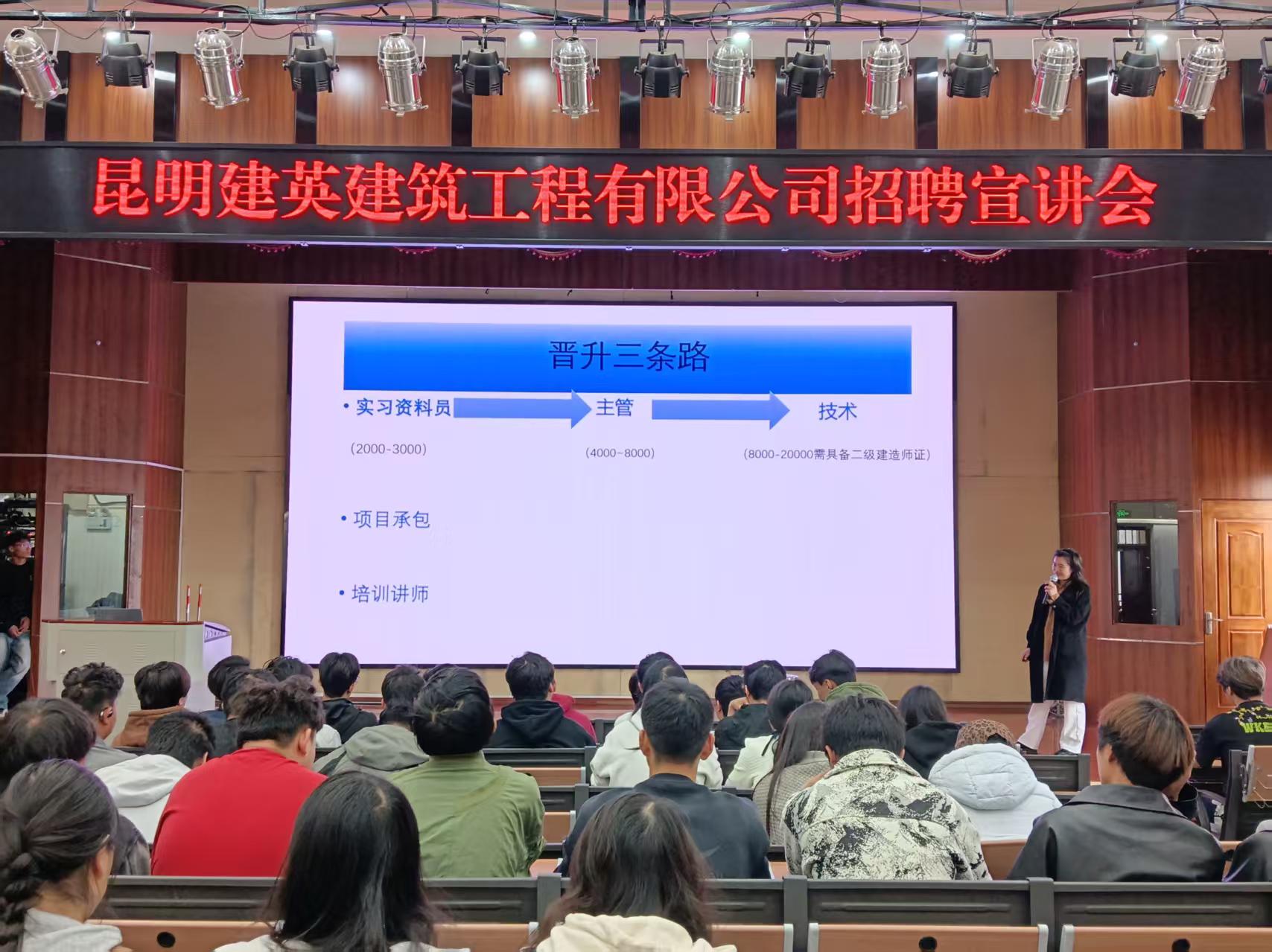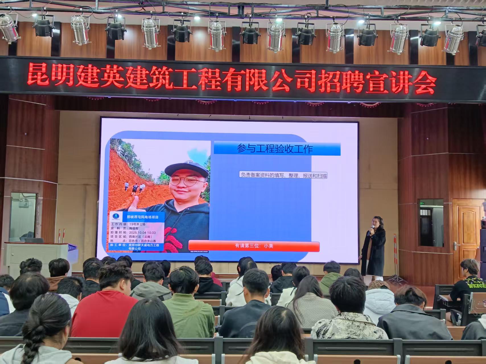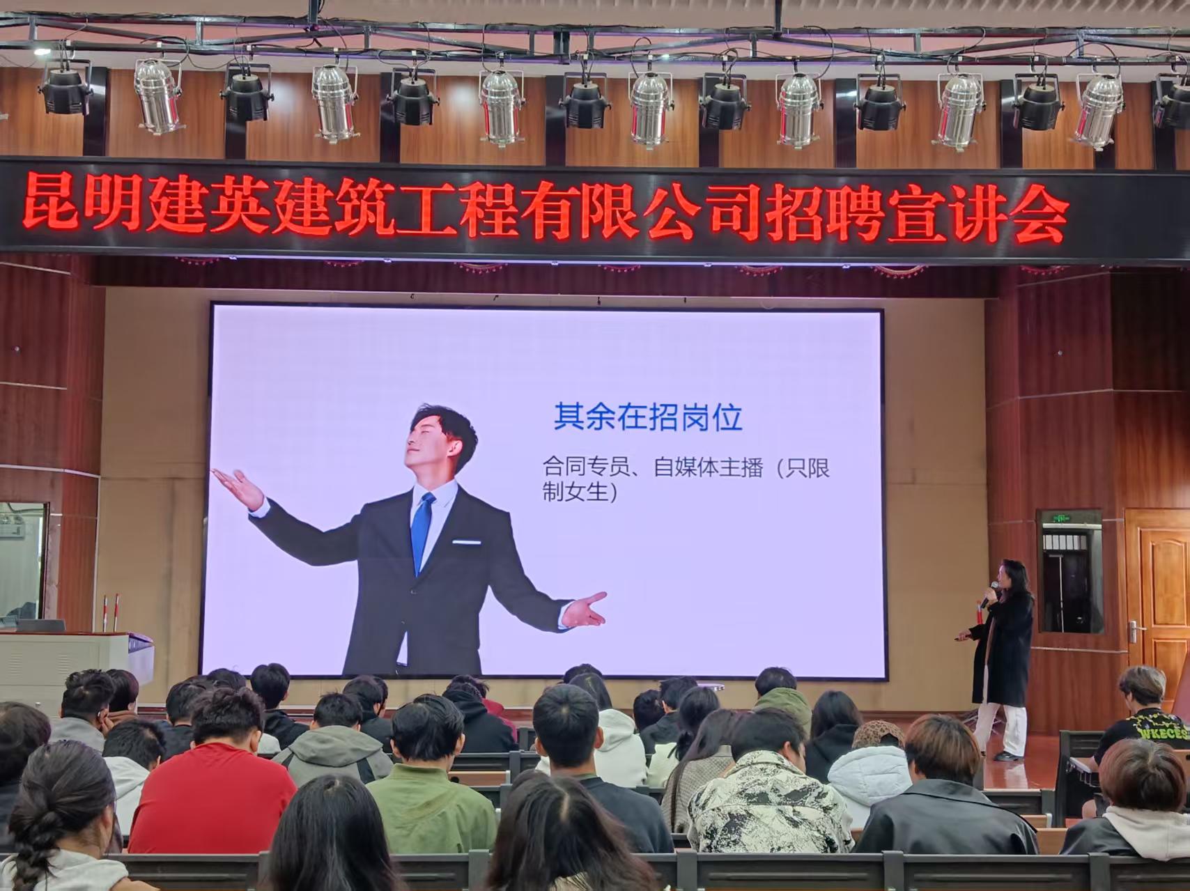 为精准对接24级五年制转段学生的岗位实习需求,搭建校企人才培养平台。10月22日下午,澳门信誉最好十大平台在光荣讲堂组织专场企业招聘宣讲会。由昆明建英建筑工程有限公司现场宣讲,24级五年制全体学生参会,与企业代表面对面交流。