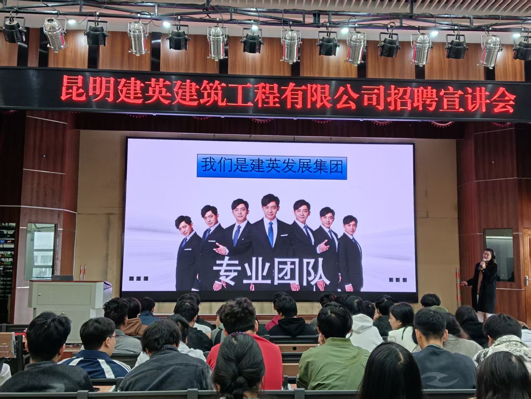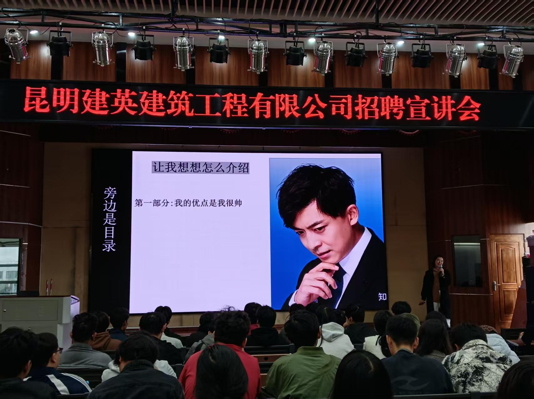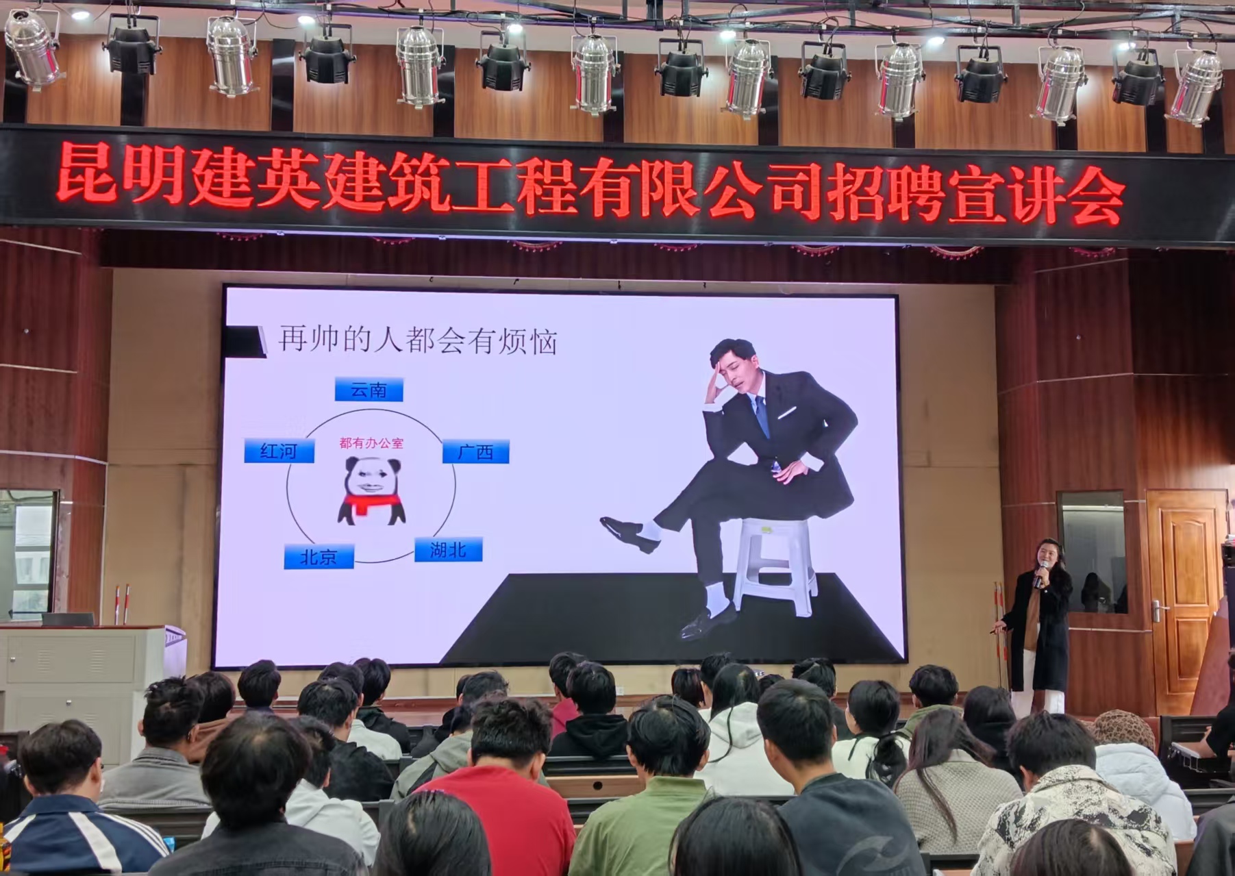 为精准对接24级五年制转段学生的岗位实习需求,搭建校企人才培养平台。10月22日下午,澳门信誉最好十大平台在光荣讲堂组织专场企业招聘宣讲会。由昆明建英建筑工程有限公司现场宣讲,24级五年制全体学生参会,与企业代表面对面交流。
