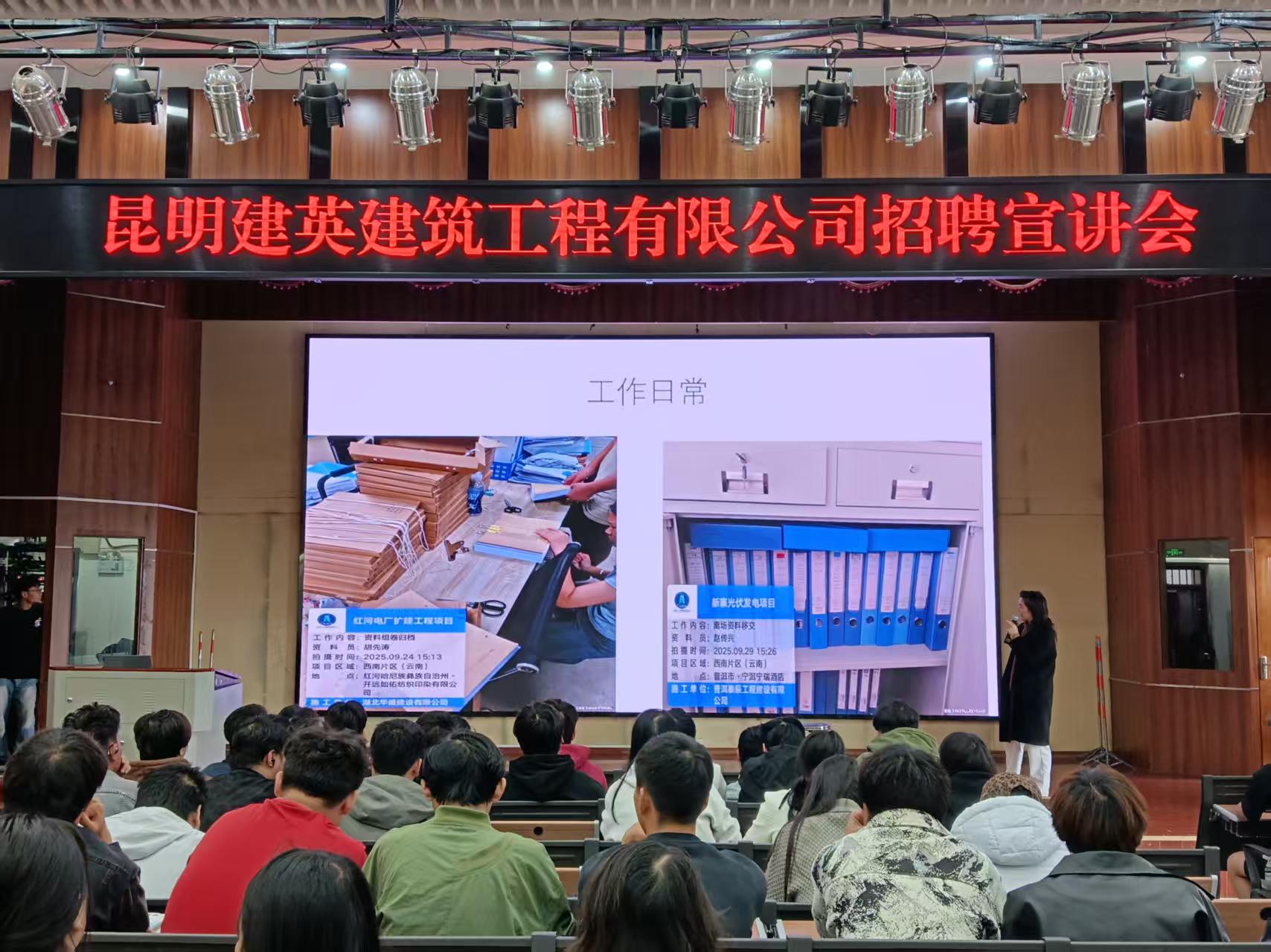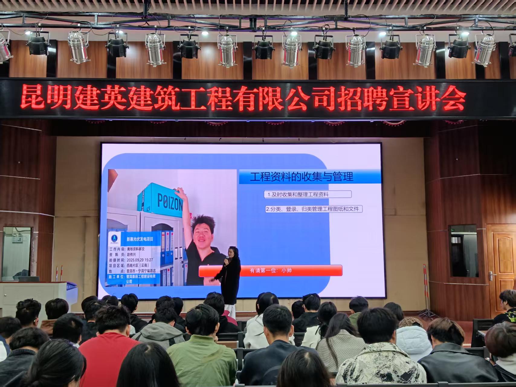招聘会上,昆明建英建筑工程有限公司代表全面介绍了企业概况,让同学们对公司的业务领域、行业定位及未来规划有了一定认知。企业代表不仅详细拆解了资料员岗位的工作职责,还通过图片展示与场景描述,直观呈现了公司办公环境、项目现场风貌、员工住宿条件,以及日常工作流程等,让同学们有了直观认识。此外,企业代表还介绍了公司在招的其余岗位,为同学们提供更多岗位选择。