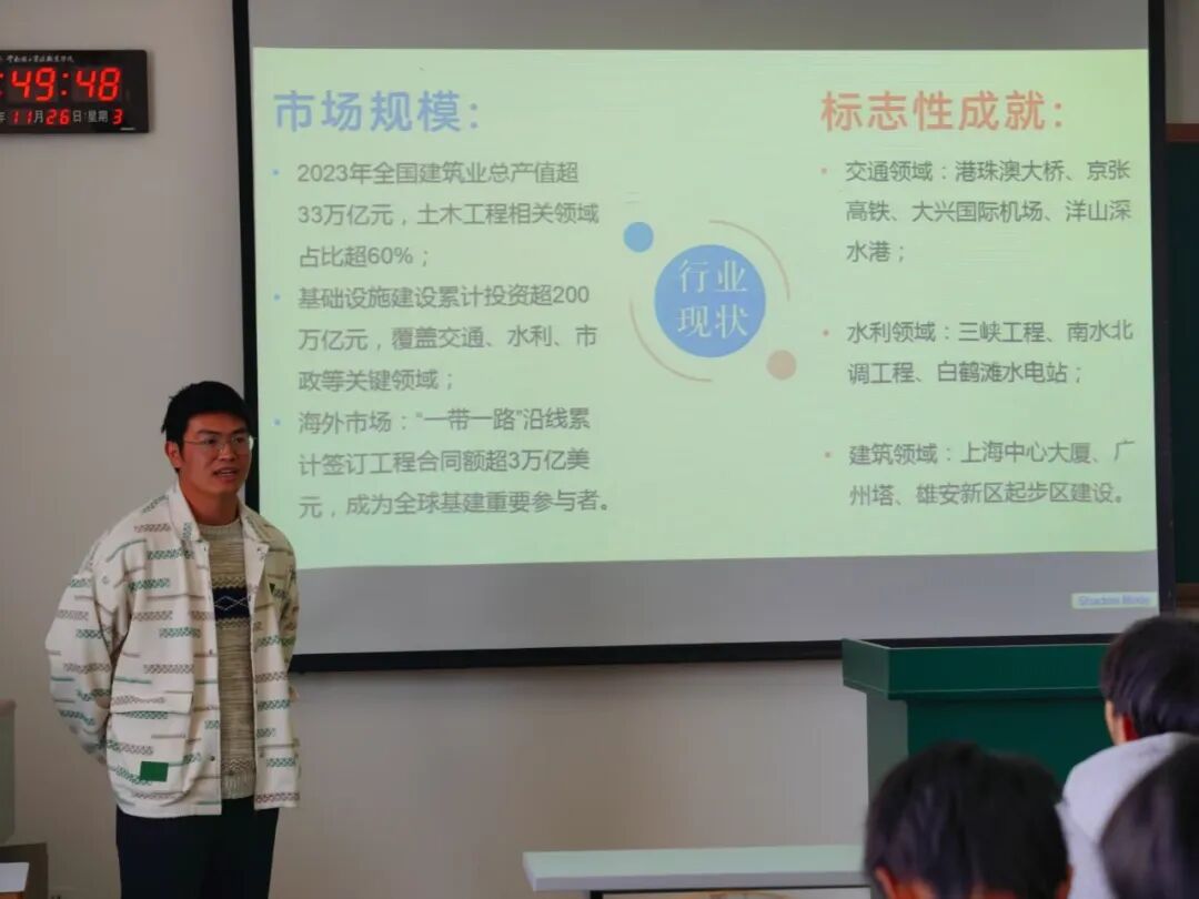 在行业认知重塑板块,他强调了“建设工程行业重经验、轻理论”的传统认知误区。他结合自己从本科实习到研究生学习的经历,用“基坑支护技术优化中的力学原理应用”“BIM技术建模中的工程美学融合”等具体案例,阐释了建设工程行业是兼具科学性、实践性与创新性的复合型专业赛道,强调学术研究为工程实践提供理论支撑,而工程实践则为学术研究指明方向,二者相辅相成、缺一不可。这一观点让在场同学们对专业价值有了更深刻的认知,也进一步激发了大家的学习热情。