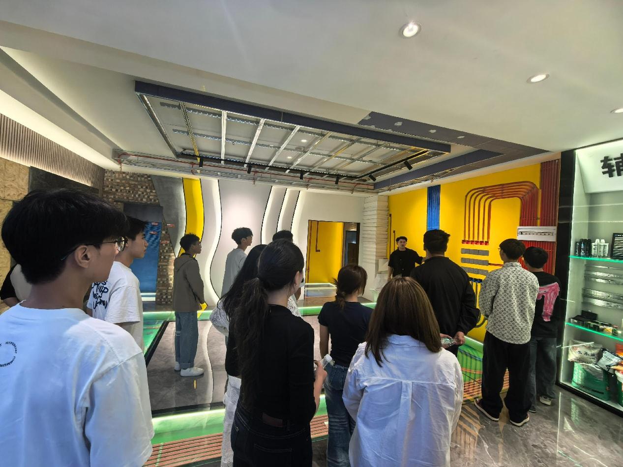 在实践认知环节,企业技术骨干莫工、杨工分两组带领师生实地观摩。通过样板房、装饰材料展示间、软装设计室等核心业务区域的现场教学,系统展示装饰工程设计施工全流程。期间特别设置前台岗位实操演示,直观呈现岗位工作规范与职业素养要求,使理论教学与企业实践实现深度衔接。