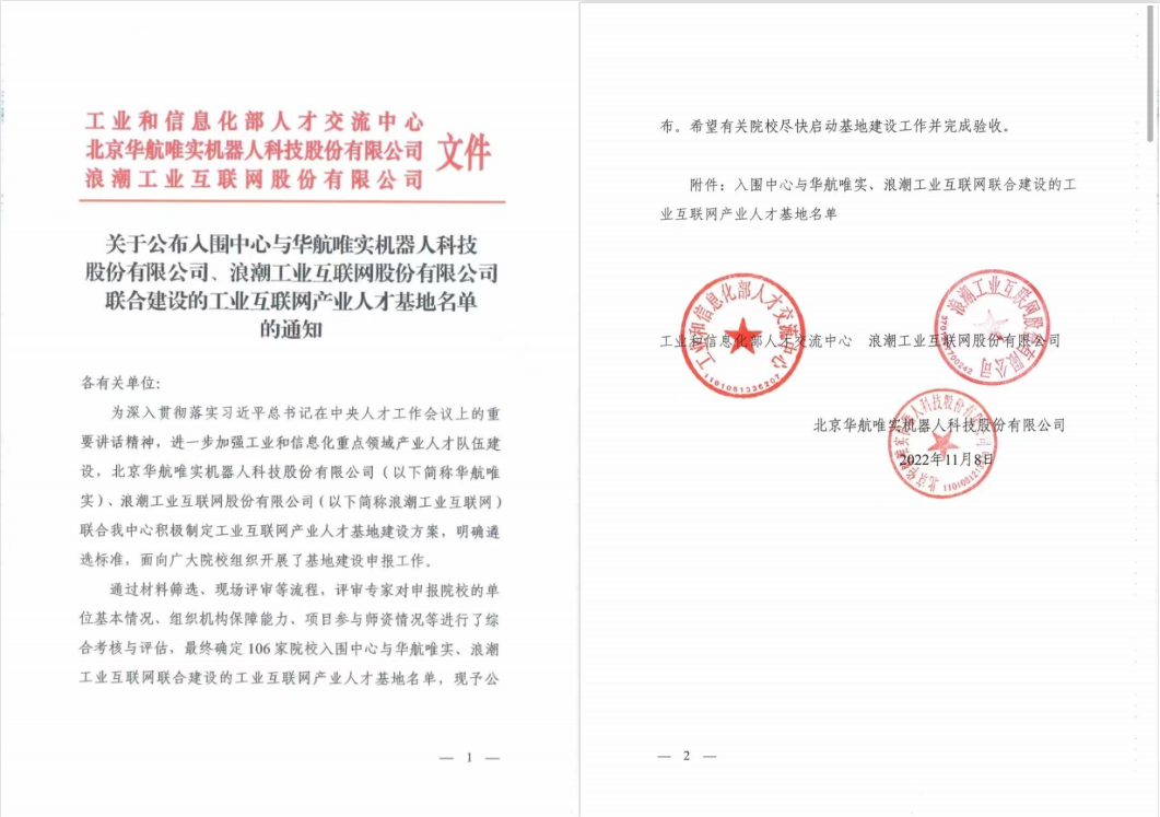 近日,工业和信息化部人才交流中心公布了与华航唯实机器人科技股份有限公司、浪潮工业互联网股份有限公司联合建设的工业互联网产业人才基地名单,bat365成功入围。这表明bat365在校企合作、产教融合方面工作力度进一步加强,高素质技术技能人才培养工作进一步深化。