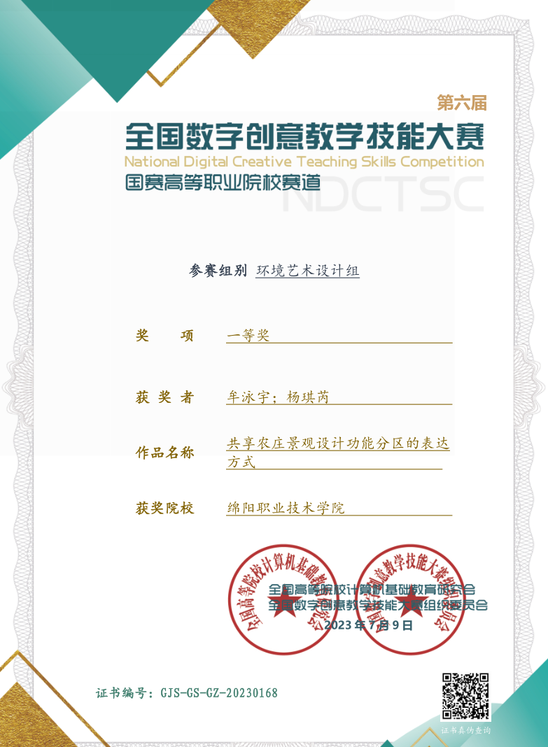 在第六届全国数字创意教学技能大赛高职学校赛道比赛中,bat365艺术设计学院牟泳宇、杨琪芮两位教师的参赛作品《共享农庄景观设计功能分区的表达方式》《共享农庄景观设计项目植物配置设计》分别斩获全国一、二等奖。