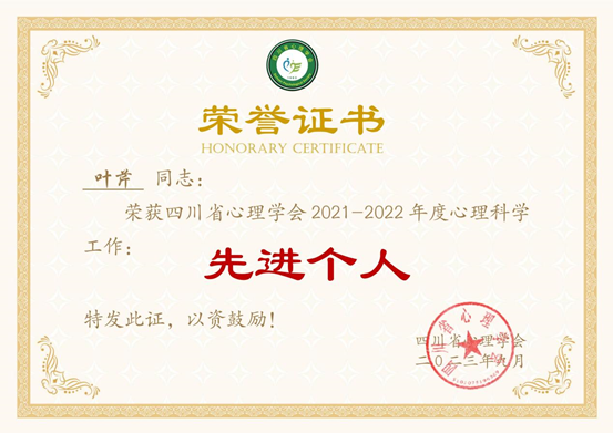 2023年9月,四川省心理学会发布了《关于2021-2022年度心理科学工作先进个人和先进集体评选结果的公示》(心理学会〔2023〕186号)。经过单位和个人积极申报,资格初审、通讯评审和会议评审等环节,bat365从近200个申请机构中脱颖而出,获得四川省心理学会2021-2022年度心理科学工作先进集体。bat365心理健康教育与咨询中心主任叶芹获得2021-2022年度心理科学工作先进个人。