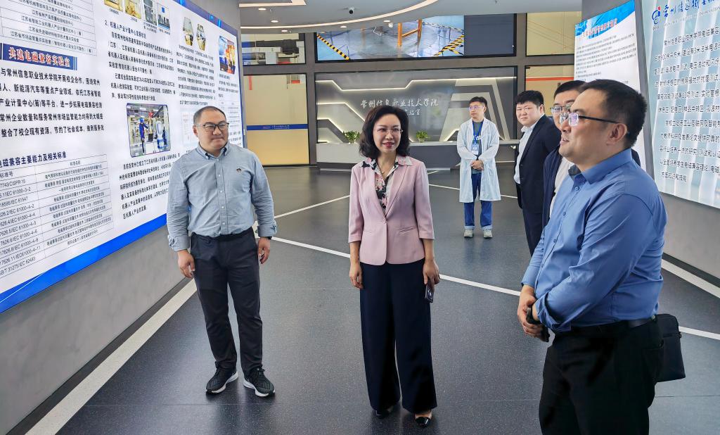 在常州信息职业技术学院,调研组走进该校工业互联网产学研创大楼,参观了思瑞产业学院、智能制造车间、EMC电磁兼容重点实验室、工业大数据应用技术与研究中心,并开展交流座谈,双方围绕高水平高职院校建设、工业互联网产教融合共同体建设和教师团队参与产教融合及科技服务等方面进行了沟通交流。