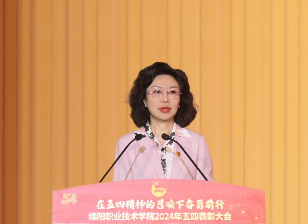 5月9日下午,学校在学术报告厅隆重举行五四表彰大会,表彰先进典型,发挥榜样作用,引领广大团员青年听党话、跟党走。共青团绵阳市委副书记王乾熙莅临大会。学校党委书记袁蓉出席会议并讲话。她强调,广大青年师生要以推动学校改革发展为己任,把个人的理想追求、奋斗成长融入学校发展大局,在各自的岗位上勇挑重担、积极作为,在建设中国特色高水平职业技术大学的征程中,展现新形象,再谱新篇章。