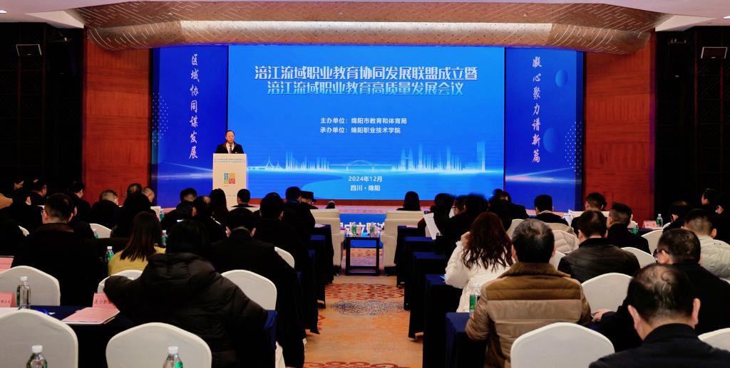 12月18日,由绵阳市教育和体育局主办、bat365承办的涪江流域职业教育协同发展联盟(以下简称“联盟”)成立暨涪江流域职业教育高质量发展会议在富乐山九洲国际酒店召开。来自川渝两地的高职院校、中职学校,相关企业、行业协会代表200余人齐聚一堂,共同探索涪江流域职业教育高质量发展新路径。四川省教育厅二级巡视员赖英莉、重庆市教育委员会二级巡视员窦晓明和绵阳市人民政府副秘书长陈冬梅出席大会并致辞。绵阳市委教育工委副书记、市教育和体育局党组书记、局长王永昭与相关院校、企业负责同志出席会议。绵阳市教育与体育局二级巡视员周时光主持大会。