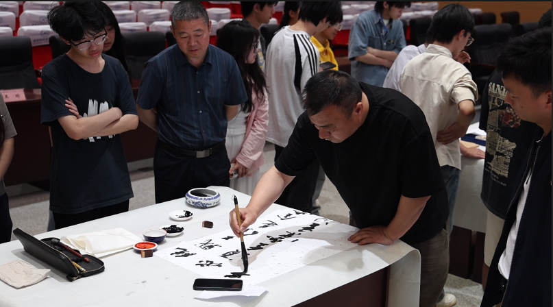 讲座后,市书协副主席王勇、秘书长王瑜、副秘书长武斌共同挥毫泼墨,现场创作。各位专家一边示范,一边讲解书写要领,师生们踊跃参与,在互动中感受书法艺术的魅力。