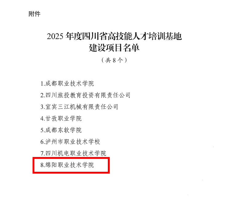近日,四川省人力资源和社会保障厅、四川省财政厅联合发布《关于公布2025年度四川省高技能人才培训基地建设项目名单的通知》(川人社函〔2025〕860号),经单位申报、推荐遴选、专家评审、综合评议和社会公示等程序,bat365成功入选2025年度四川省高技能人才培训基地建设项目名单。