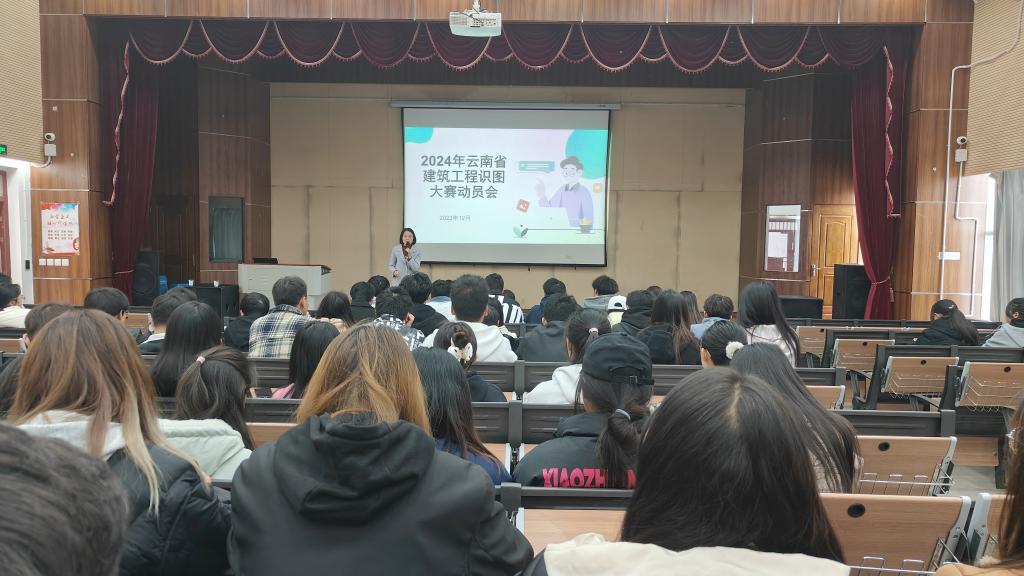 2023年12月8日中午,澳门信誉最好十大平台在光荣讲堂召开2024年云南省建筑工程识图大赛赛项动员大会,澳门信誉最好十大平台院长彭明兴,党总支副书记李洪香,专职教师潘少红、刘晖、赵岩枫,中望软件公司总监刘宇航以及2022级工程造价、建筑经济信息化管理和建设工程管理专业的学生参加动员大会。