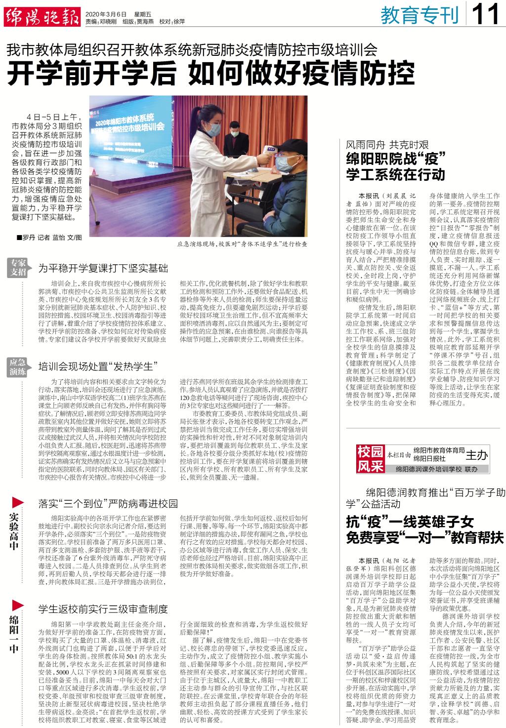 庚子新年,一场没有硝烟的疫情阻击战在祖国大地上全面打响。面对严峻的疫情形势,绵阳职院党委把师生生命安全和身心健康放在第一位,把疫情防控作为当前首要政治任务。在该校防疫工作领导小组直接领导下,学工系统立即行动,坚持抗疫与暖心并举、防疫与育人结合,严把精准排摸关、重点防控关、安全返校关,抓严抓细抓实各项防控举措,全时段上岗,24小时在线,守护学生的平安与健康。截至目前,学生中无一例确诊和疑似病例。四川教育信息网、四川职教网、现代职教网、四川报道等媒体纷纷报道学工系统的抗疫措施。