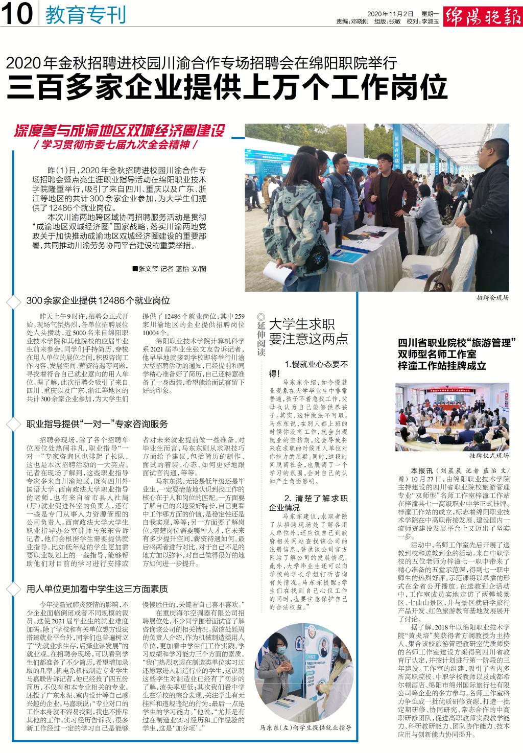 绵阳晚报、绵阳观察、绵阳新闻网:学院举行2020年金秋招聘进校园川渝合作专场招聘会暨“点亮生涯”职业指导活动