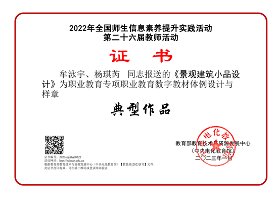 近期,教育部教育技术与资源发展中心(中央电化教育馆)发布关于总结2022年全国师生信息素养提升实践活动(第二十六届教师活动)参与情况的通知,bat365艺术设计学院教师牟泳宇、杨琪芮提交的《景观建筑小品设计》职业教育数字教材体例设计与样章被评为职业教育专项典型作品。