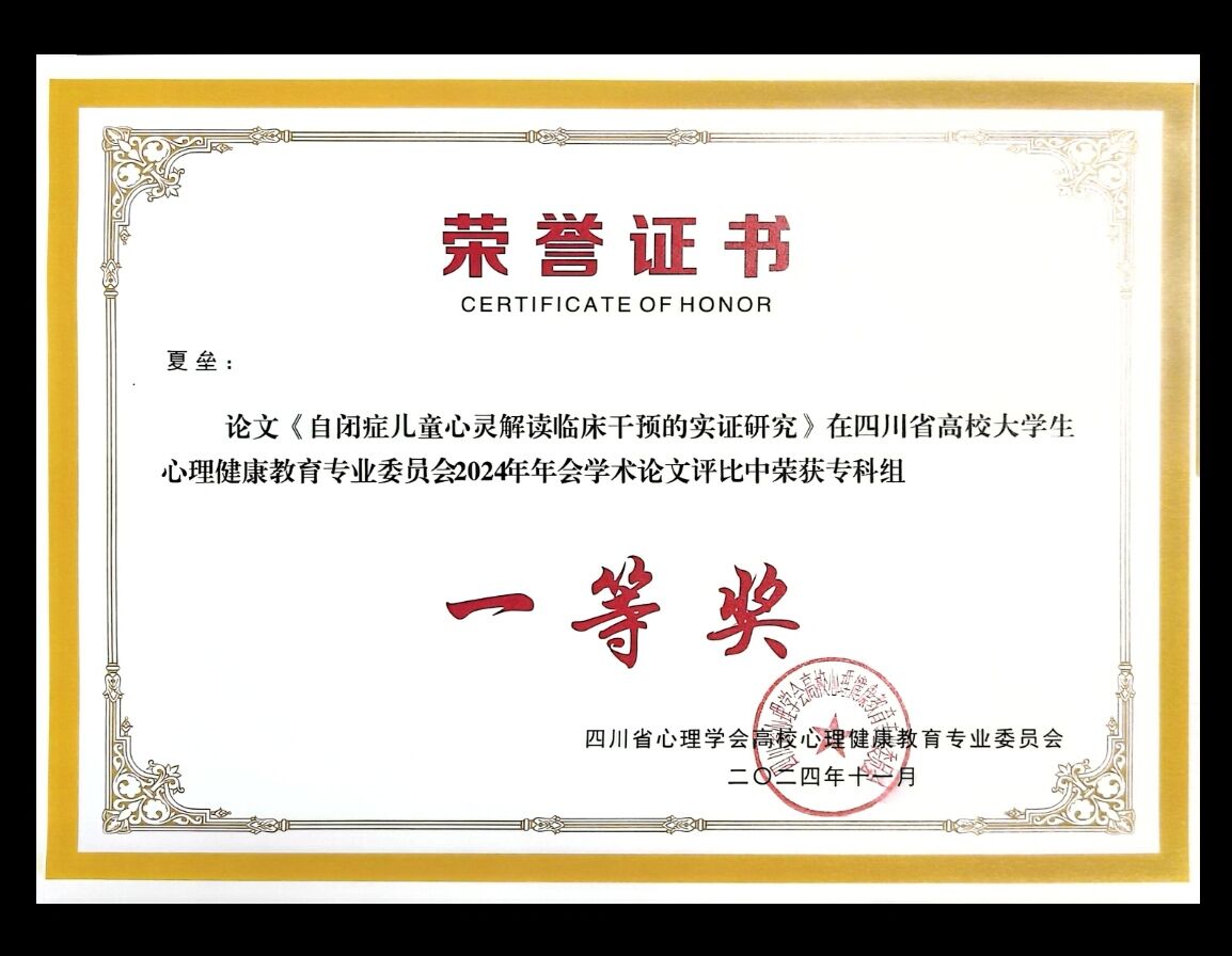本次年会的主题为“弘扬教育家精神,做实做精高校心理健康工作”。年会汇报了2024年度工作,重点介绍了我省各高校心理健康教育工作的进展和成绩。会上,bat365教师聆听了专家学术讲座,在专业技能工作坊中学习前沿的心理健康教育理念和方法。其中夏垒撰写的论文《自闭症儿童心灵解读临床干预的实证研究》荣获优秀论文一等奖,并在年会现场进行了学术汇报。