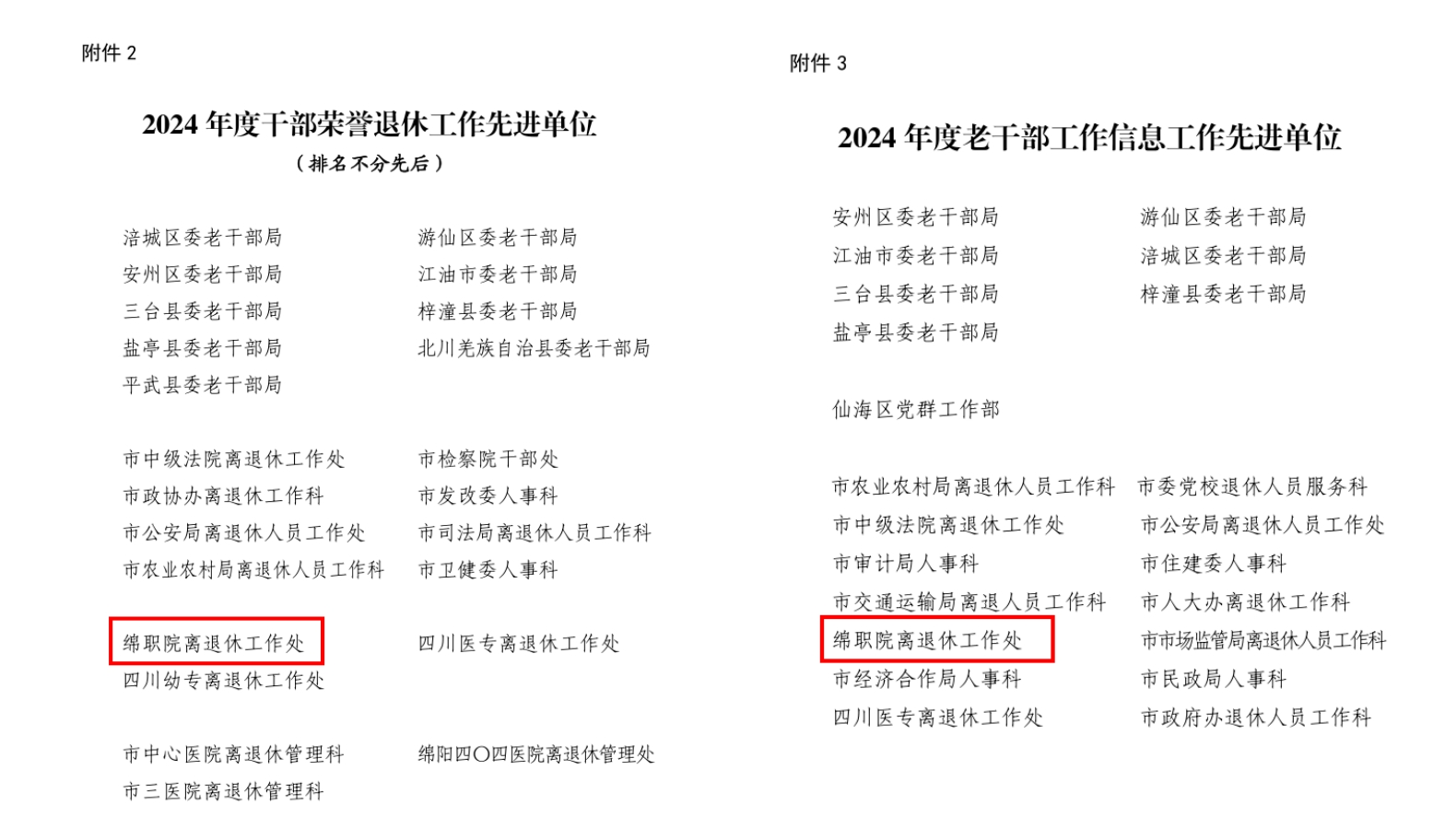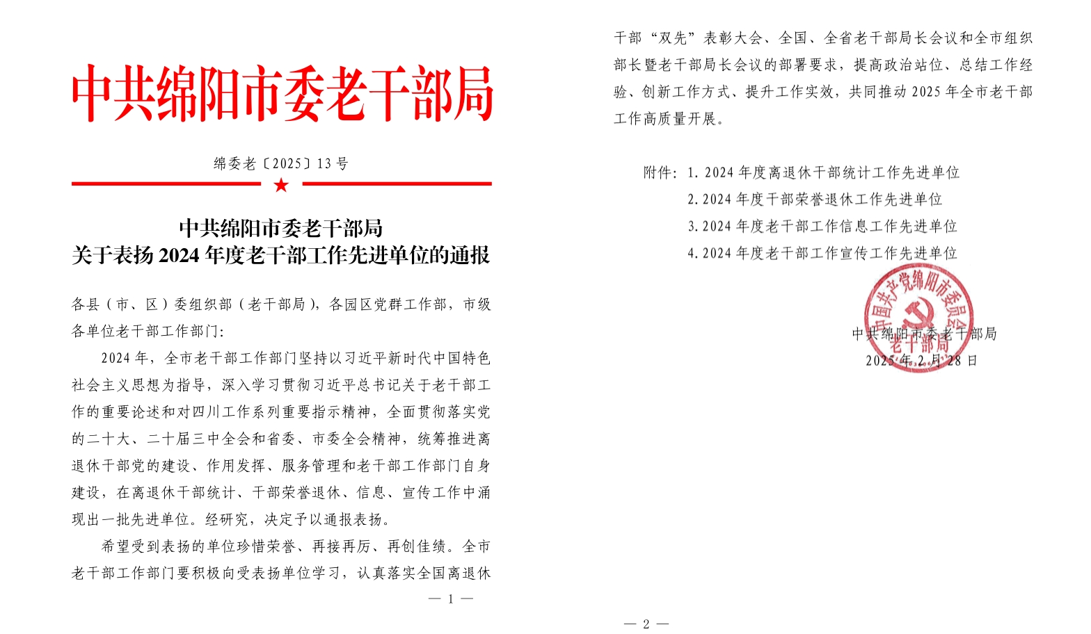 近日,中共绵阳市委老干部局下发绵委老〔2025〕13号文件,通报表彰了2024年度老干部工作先进单位。bat365离退休工作处被评为2024年度“干部荣誉退休工作先进单位”和“老干部工作信息工作先进单位”荣誉称号。