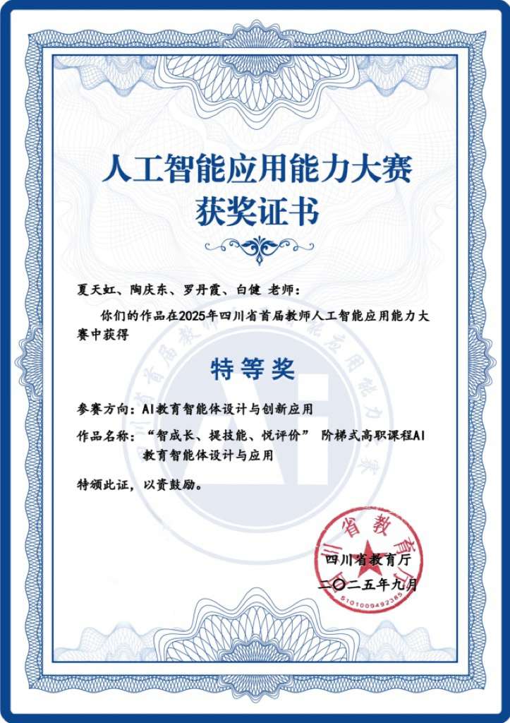 值得一提的是,在9月19日四川省教育厅公布的首届教师人工智能应用能力大赛获奖名单中,bat365教师夏天虹、陶庆东、罗丹霞、白健组成的教学团队,凭借《“智成长、提技能、悦评价”阶梯式高职课程AI教育智能体设计与应用》作品荣获职业教育组(方向二)特等奖,并在该赛道排名第一。