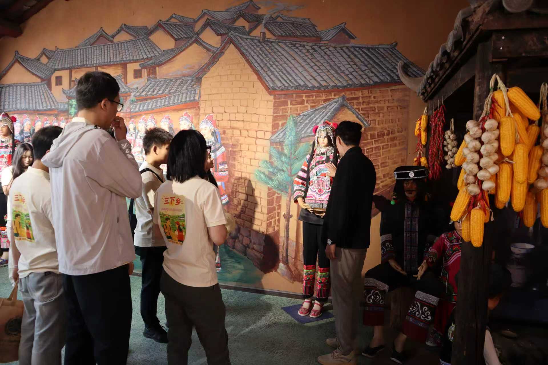 随后,大家来到铸牢中华民族共同体意识主题教育馆,国家级非遗彝族民歌、酒歌与多民族服饰交相辉映,“像石榴籽一样紧紧抱在一起”的生动场景让师生深受触动