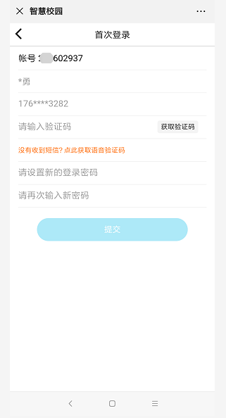 6、输入账号(登录账号为学号)和密码(初始密码666666)进行登录,初次登录需修改密码,输入手机号,获取短信验证码,设置新密码(修改后的密码请牢记)。