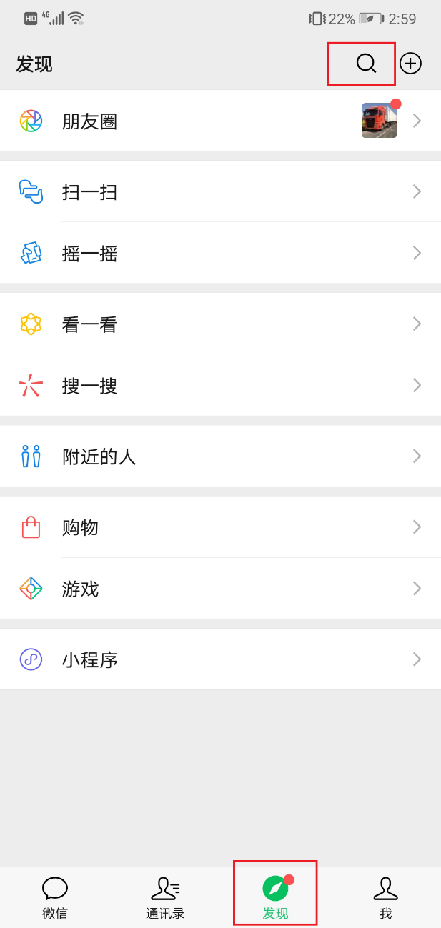 1、打开微信,进入“发现”界面,点击右上角的