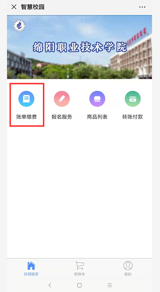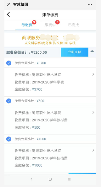 7、点击“账单缴费”查看缴费信息。仔细核对姓名和学号是否正确,点击“立即支付”,若学号或姓名不正确,请暂停缴费,并联系辅导员。