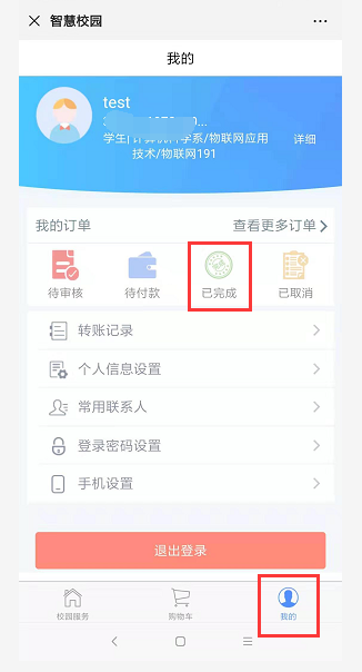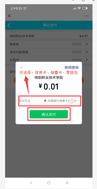 9、选择零钱包或信用卡进行支付(图例为储蓄卡),确认支付,输入支付密码,即可完成支付。可点击“我的”--->“已完成”查看缴费记录。