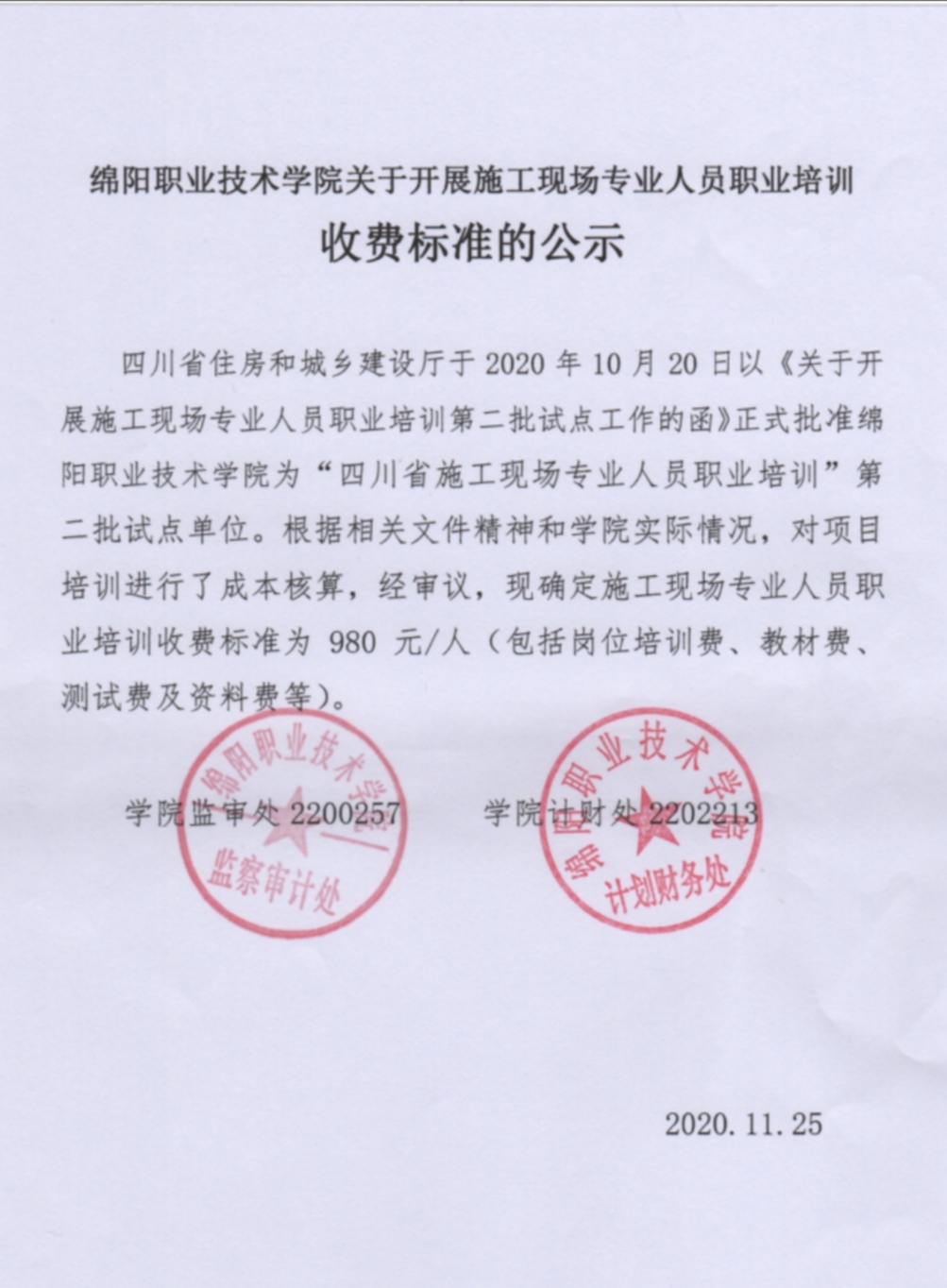 bat365中文官方网站关于开展施工现场专业人员职业培训收费标准公示