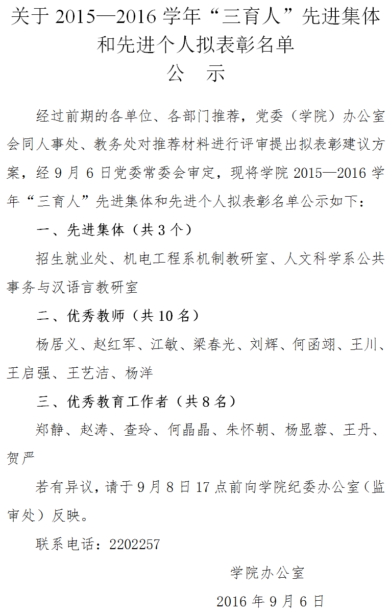 2015—2016学年“三育人”先进集体和先进个人拟表彰名单公示