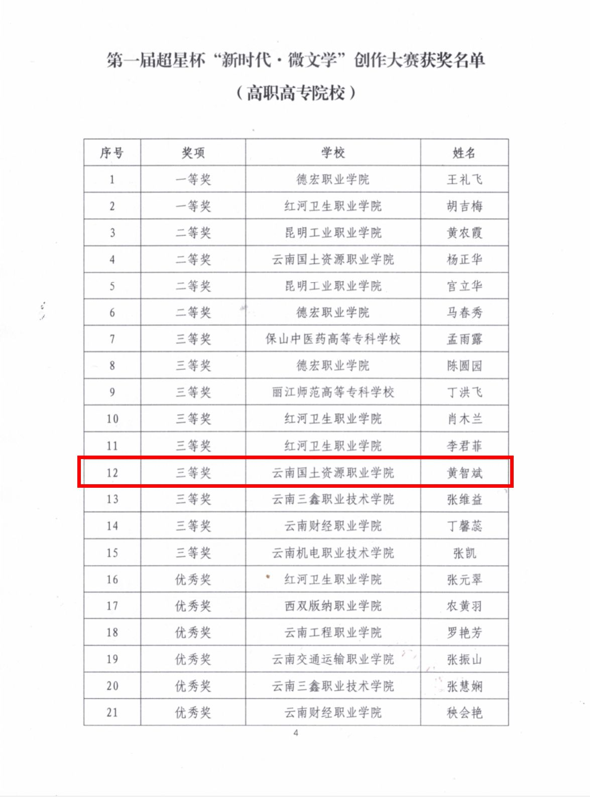 5月31日,由云南省高等学校图书情报工作指导委员会、云南省高校图书馆联盟主办,北京超星数图信息技术有限公司承办的第一届超星杯“新时代·微文学”创作大赛比赛结果公布,来自澳门信誉最好十大平台2020级钻探一班的黄智斌同学,荣获高职高专院校组三等奖。